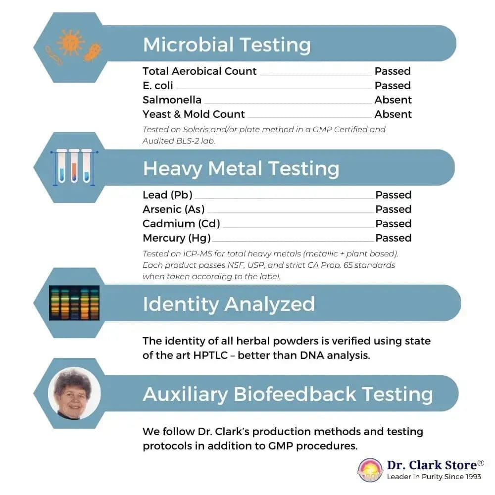 Dr. Clark Store products are tested for microbiology, heavy metals, and identity. We also test products for certain toxins using Dr. Clark’s biofeedback device called a Syncrometer.