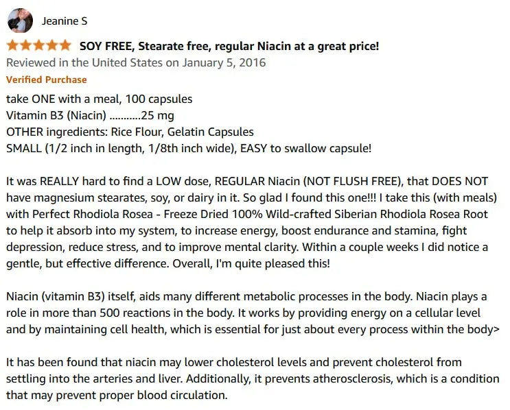 Keep in mind that niacinamide is an option, although not as potent as pure niacin, for those who cannot tolerate the niacin flush. When taking pure niacin you may experience flushing from the top of your head down to your lower back. This is a harmless reaction but you may want to limit the intensity of the flush by starting with small amounts of niacin.