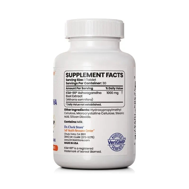 KSM-66® ashwagandha (Winthania somnifera) root extract, hydroxypropylmethyl cellulose, microcrystalline cellulose, stearic acid, silicon dioxide